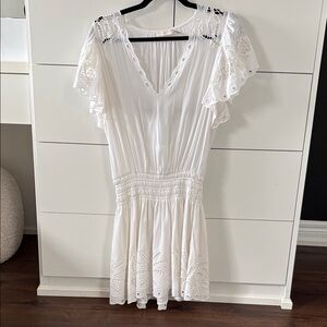 Ramy Brook mini dress in white. V-neck with eyelet lace flutter sleeves. Smocked waist and flowy skirt with embroidered hem. Lightweight, breathable fabric. Elegant casual style.