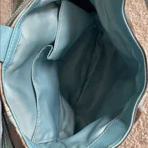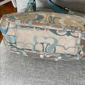 Rare Coach shoulder bag with a stylish beige and teal design. Awesome colors. Perfect for any occasion.Good condition. Three pockets. Some discoloration at bottom of two of the pockets. Few snags on back of bag.