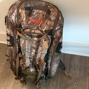 Durable backpack with a woodland camouflage design. Ideal for outdoor adventures. Features multiple compartments and sturdy straps.
