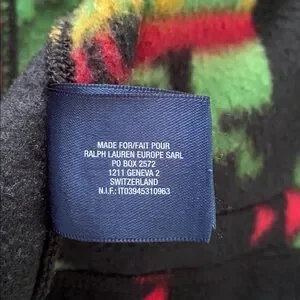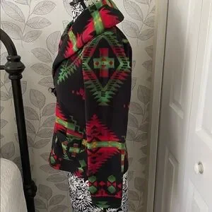 Girl’s Ralph Lauren fleece collared jacket with single toggle closure. Size 16 girls. EUC. Black base with red, green, and yellow Southwestern Aztec type print. Soft polyester fleece fabric. Classic brand embroidery on tag. See pics for measurements