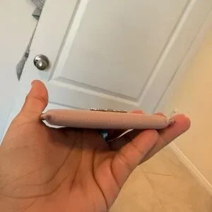 Chic blush leather card holder with iconic logo detail. Ideal for stylish organization.