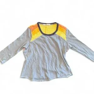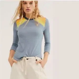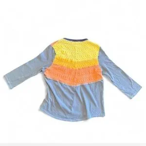 blue body vibrant orange and yellow crochet/stretch-knit detail