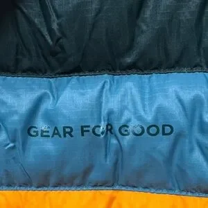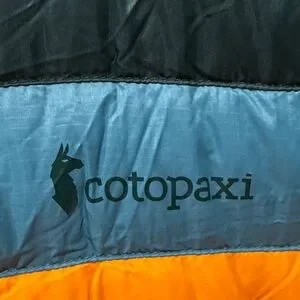 Women’s Cotopaxi vibrant puffer jacket with green, blue, and orange stripes. Primary color is dark green. Lightweight and warm. Ideal for outdoor activities.