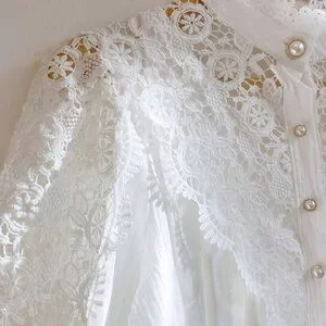 Experience timeless Victorian charm with this white elegant shirt blouse featuring a delicate lace overlay and a mock neck stand collar. The puff bishop sleeves add a graceful silhouette, while the regular fit and classic hem provide comfortable everyday wear. Designed as a single‑piece shirt, it offers a refined look without pockets, perfect for layering over trousers or skirts.