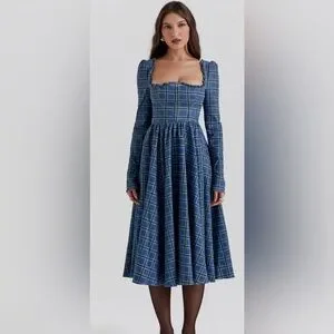 House of CB Delia tartan plaid check dress long sleeve blue green L+ xl midi