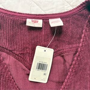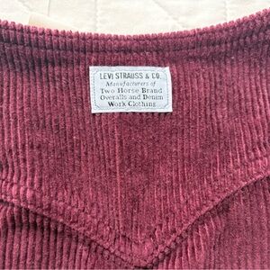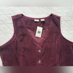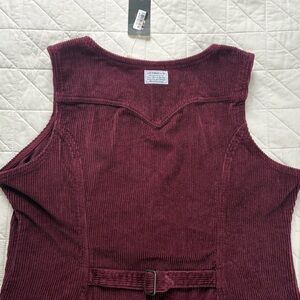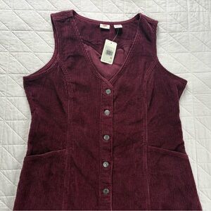 Levi's, corduroy, dress, pinafore, burgundy, XL, NWT, new with tags, workwear, vintage style, buckle back, button front, sleeveless, winter fashion, layering, aesthetic, plum, maroon, Levi Strauss, utility, mini dress, fall style, oversized vest.