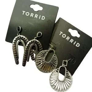 Two pairs of Torrid earrings. NWT. One horseshoe shaped with posts. One filigree with hooks. Silver color but no content tags.
