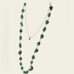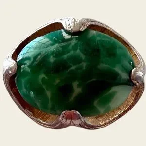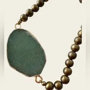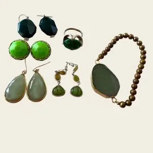 This exquisite jewelry set features stunning green gemstones, perfect for adding a touch of elegance to any outfit. The set includes a 16”wire wrapped gemstone necklace, Geometric HONG KONG stamped bright green Celluoid 1960s clip on earrings, two wire pierced hanging earrings one of them is aventurine tear drop , a 3 dangle stone post pierced earrings a gold tone chain with a dark green crystal charming pendant and a natural agate green vintage gold tone adjustable ring , and a large aventurine stone with gold tone beads bracket , 8 pieces all designed to complement each other beautifully. Ideal for special occasions or everyday wear.