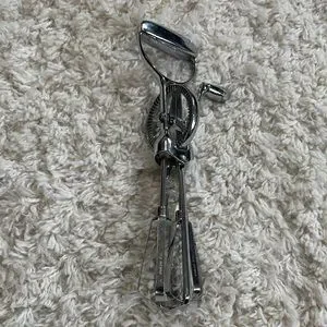 Vintage classic hand-crank egg beater. Chrome metal finish. Two beaters with rotating gears. Simple, functional kitchen tool. EUC