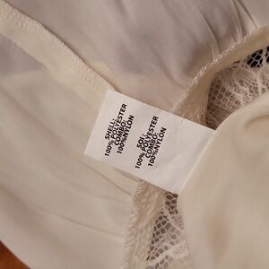 Lace panel on the skirt adds charm to this delicate ivory dress .