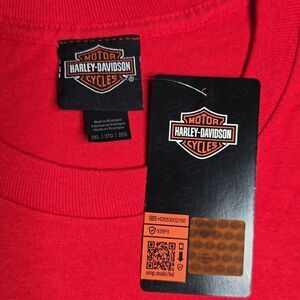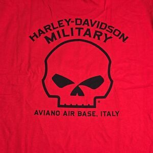 Men's long-sleeve, crew-neck t-shirt with graphics on front, back and both sleeves. Exclusive H-D Military location print of Aviano Air Base, Italy, shows military pride and appreciation and honors the overseas U.S. Military base. Genuine Harley-Davidson trademarked apparel. 100% Cotton. Red. Men's Classic Fit