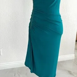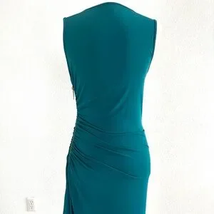 This dress is a sleek and elegant sleeveless sheath design in a rich teal color. It features a high, round neckline and a body-hugging silhouette that accentuates the figure. Subtle side ruching adds texture and a flattering drape around the waist, while an asymmetrical hemline gives it a modern, fun, sophisticated touch. The soft, stretchy fabric enhances comfort while maintaining a polished look, ideal for cocktail parties or semi-formal occasions. Unlined.