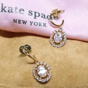 Delicate kate spade drop earrings with oval center crystals. Sparkling crystal halo in a gold-tone setting. Classic and feminine design for dressy looks. 1.10” long. Comes on card with a KS pink bag.