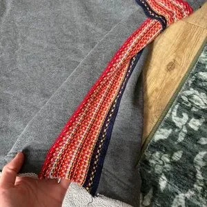 The exposed raw edges and colorful knitted insert make this pullover so unique!