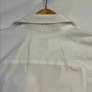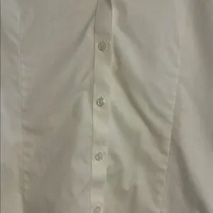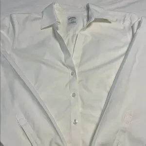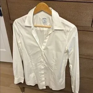 Brooks Brothers women’s dress shirt. Fitted silhouette with a classic point collar. Smooth, non-textured fabric appearance. Clean, versatile white tone for formal looks.
