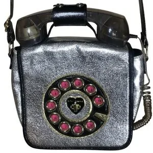 Unique silver handbag with a retro telephone design. Features gold and pink accents.