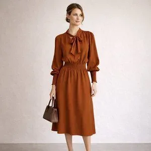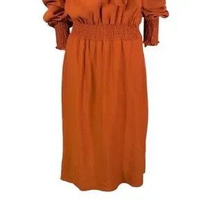 features: 100% rayon fabric. Long balloon style sleeves with high cuffed wrists. V neckline with tie detail. Smocked expandable waistline. Midi Length. Pull over.
