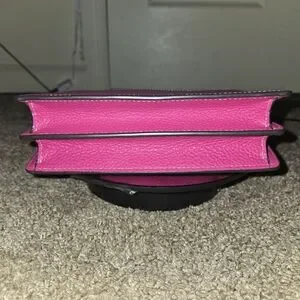 Suede interior, 4 compartments, 1 zippered. 1 inner slip pocket and 1 back slip pocket.