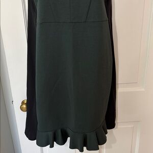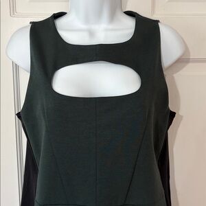 Chic sleeveless mini dress with a unique cutout neckline. Features a playful ruffled hem. Perfect for stylish outings. Size Large. Interior tag removed.