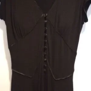 This is a fit and flare knit maxi dress with satin trim. The drop waist and v neck are accented by the button front and cap sleeves. Pull on style. Wrinkle free perfect for travel. Formal or concert attire.