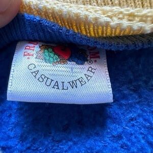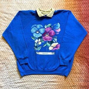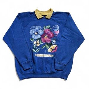 Vintage 1990s Blue Floral Pansy Crewneck Sweater with yellow Collar L