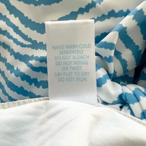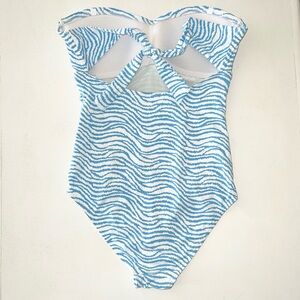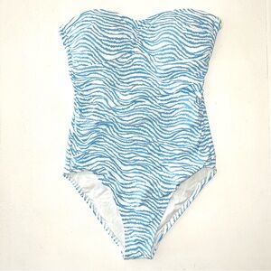 Classic resort style J.McLaughlin strapless one-piece swimsuit in a beautiful blue zebra / wave print. Flattering structured bodice with ruching and a chic tie-back detail for a secure fit. Timeless coastal style perfect for resort vacations, beach days, poolside lounging, or summer travel.