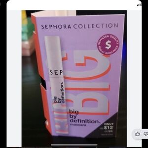 Sephora Collection Big by Definition mascara in purple-lavender and coral box. Sleek white mascara tube with black text. Lightweight, lengthening formula for defined lashes.