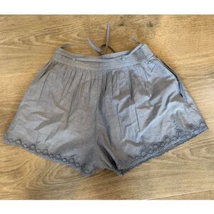 Made from soft chambray, these summery high-waist shorts feature a slender tie belt and a lacy scallop-trimmed hem.