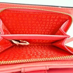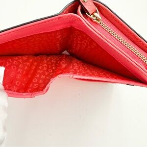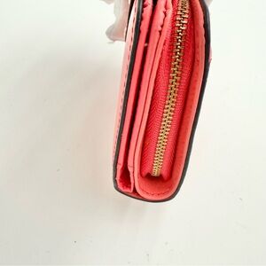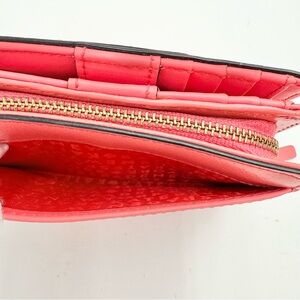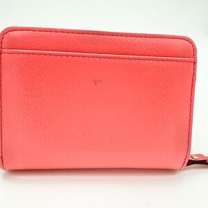 This is a compact bi-fold wallet with credit card and ID pockets as well as zippered coin compartment and gold hardware. Gorgeous coral color. In GUC, there are minor flaws on the leather (one spot on the exterior, cracking on the interior) that are shown in the video. Please see all photos for condition. Let me know if you have any questions! Bundle and save, and please note that I reuse shipping materials whenever possible ♻️