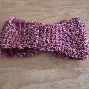 Soft crocheted headband in a dusty rose blend. Features a decorative flower with a pink jeweled brooch center. Stretchy and cozy knit. Stylish accessory for cool weather.