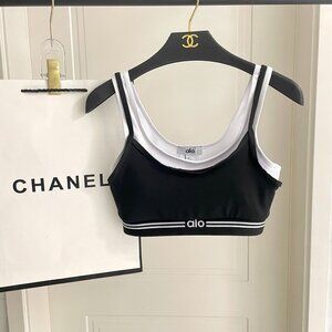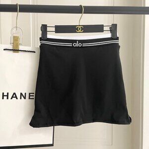 Two-piece ALO Yoga set with a supportive ribbed sports bra. Matching skirt with elastic logo waistband. Clean black fabric with white trim and logo. Comfortable, sporty design for workouts or casual wear.