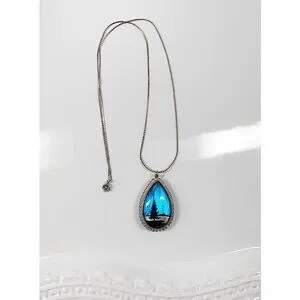 You can choose to display the Forest with the aura borealis sky or the be on a starry palm tree beach! This teardrop pendant features real blue Morpho iridescent butterfly wings as the background with reverse, hand-painted plastic bubble overlays for a 3D effect.