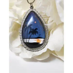Vintage Morpho Butterfly Wing Pendant Necklace Painted Forest Palm Tree Blue