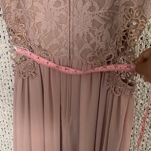 Sleeveless hi-low dress with lace bodice. Beaded and sequined neckline and waist accents. Flowy chiffon skirt in a soft blush tone. Elegant and feminine style.