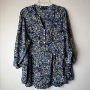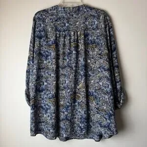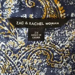 Zac and Rachel Woman Blue and Gold Paisley Blouse Roll Tab Sleeves 2X