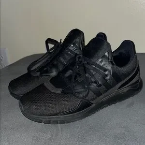 Adidas all black athletic sneakers in US size 5. These shoes were only worn exactly 3 times and are still in excellent condition. Lightweight design with a breathable mesh upper and cushioned sole for comfort. Features the classic Adidas three stripe look in a sleek all black colorway that works great for workouts, walking, running, or everyday casual wear. Very clean pair with minimal signs of use.