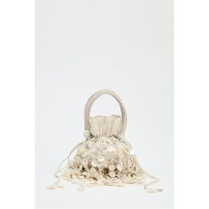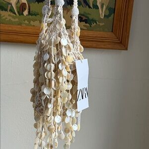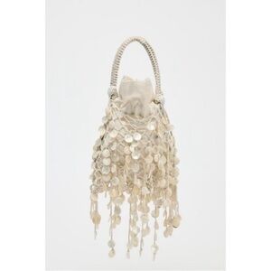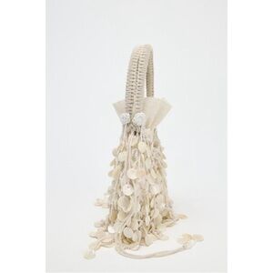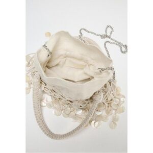 NWT Zara pearlescent shell bucket bag in a soft cream tone. Features delicate shell disc beading throughout, a structured mini bucket silhouette, top handle, and removable chain strap for crossbody wear.