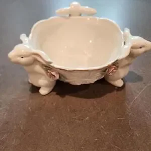 This beautiful candy dish is perfect for Easter and Spring decor. The white ceramic and porcelain bowl features a charming round shape with a bunny character design. The bunny is surrounded by lovely pink roses with gold edges that add a touch of elegance to the piece.