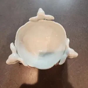 It is a medium-sized pot with a height of 3.5 inches and a length of 8 inches. The bowl can be used for candy or as a flower pot. It is a great addition to any room in the house. The item is from the 1970s and has a glazed finish. The product does not require any additional parts and is not customized.