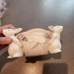 Easter Bunny With Pink Roses Gold Edged Bowl Candy Dish Flower Pot Decor
