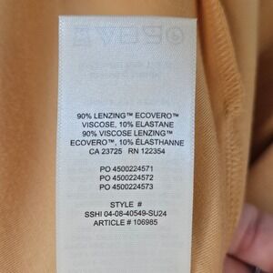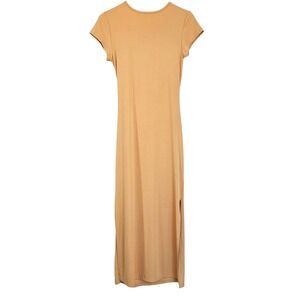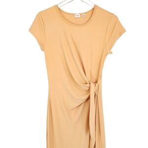 Wilfred Aritzia midi dress in a warm apricot yellow hue offers a sophisticated yet relaxed silhouette. Crafted from a soft, stretchy blend of Lenzing Ecovero viscose and elastane, it features a classic crew neckline and short sleeves. The standout design element is the fixed side-tie detail at the waist, which creates elegant draping and a flattering cinched effect. A high side slit adds movement and a touch of allure to the straight hemline.