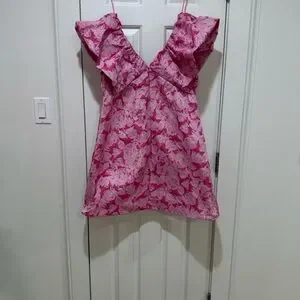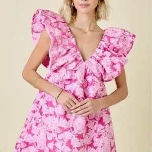 Bright pink mini dress with light pink floral print. Deep V-neck with dramatic ruffle shoulders. Playful A-line silhouette. Lightweight, flirty look.