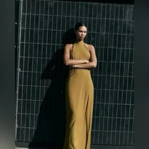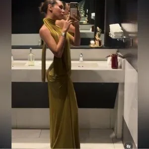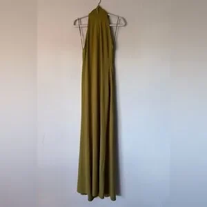 Elegant olive green halter maxi dress. Draped silhouette with long neck ties. Sleek, floor-length fit for evening wear.