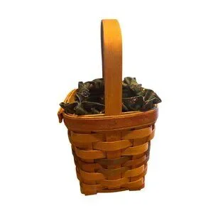 No visible flaws. Measurements: Height with handle = 10 inches, Basket height = 6 inches, Width = 5.5 inches.