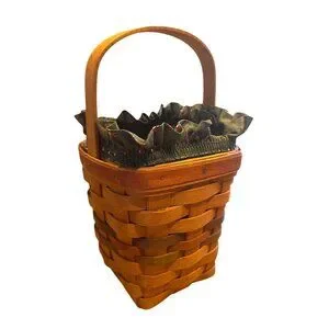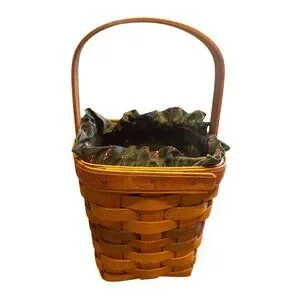 This handwoven Longaberger Shades of Autumn Bittersweet basket features a sturdy wooden handle and a green floral fabric insert with ruffled edges, offering both style and functionality.
