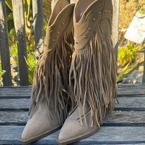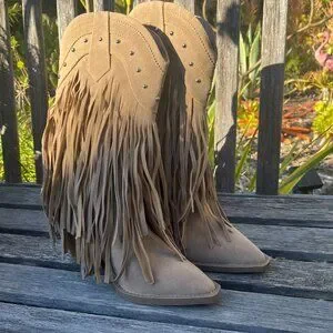 Forever Beige Faux New Suede/Leather Layered Fringe Boots, Size 9, Model: Anita-26, Step into brand new style! These Forever Beige Suede/Leather Layered Fringe Boots (Size 9) have never been worn! Featuring soft suede, beautiful layered fringe, and a versatile neutral tone—perfect for elevating any outfit from casual to chic. Western cut 3" heels, 14" diameter opening, 14" overall height, Easy pull on, fun stud detailing at the top! Comes from a smoke free home! Fast Shipping!