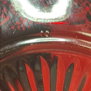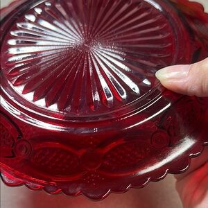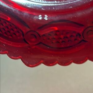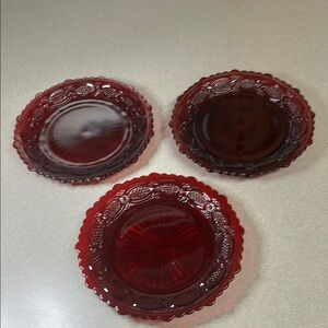 Avon ruby red glass dessert plates. Cap cod design. Perfect for dessert. 3 available. Please note that there are no chips. There are scratches in the food serving area from use.