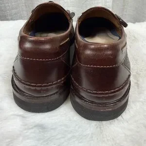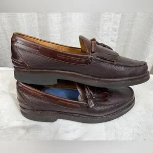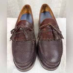 Classic E.T. Wright men’s tassel loafers in a rich brown leather finish. Features include woven leather detailing along the collar, kiltie fringe, and dual tassels for a traditional, polished look. Made in the USA, size 12 A (narrow fit). Soft leather lining and sturdy rubber outsoles provide comfort and durability. Ideal for office wear, business outfits, church, and everyday classic style.