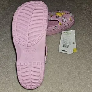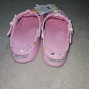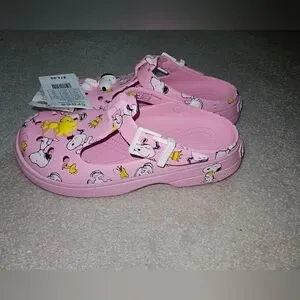 Adorable pink CROCS mules. Features Snoopy and Woodstock design. Comfortable and playful.