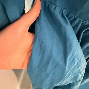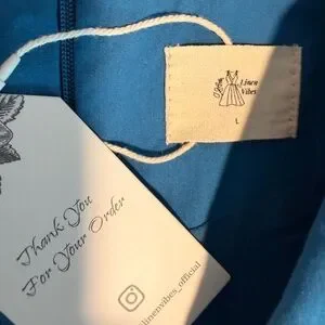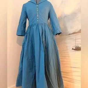 Classic blue midi dress with button-front bodice. Fitted waist and full skirt. Three-quarter sleeves. Timeless, versatile silhouette. All cotton construction fully lined w/ pockets.